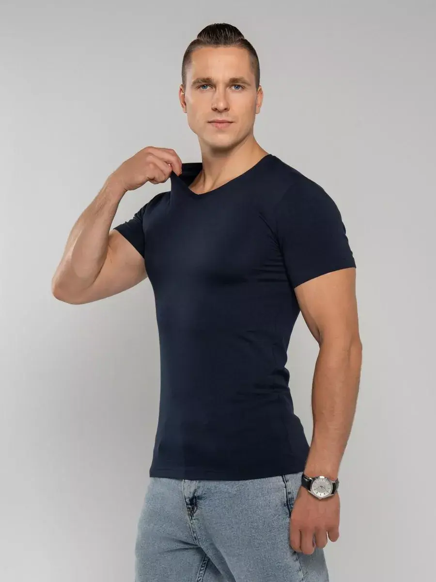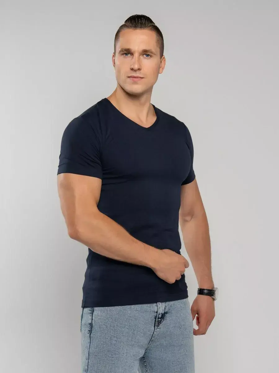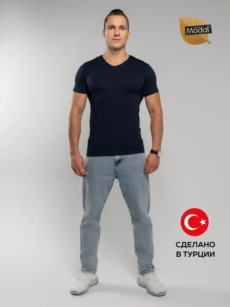 Мужская классическая футболка из модала с хлопком облегающего силуэта с V-образной горловиной. Обладает благородным внешним видом и повышенной прочностью. Модал- экологичная тань, не содержит в составе токсичных компонентов. По гигроскопичности ткань в полтора раза превышает хлопок. Изделия из модала хорошо пропускают воздух, позволяя коже дышать. Футболка не линяет, не выцветает, практически не мнется. Благодаря отсутствию боковых швов, изделие устойчиво к деформациям в результате многочисленных стирок.