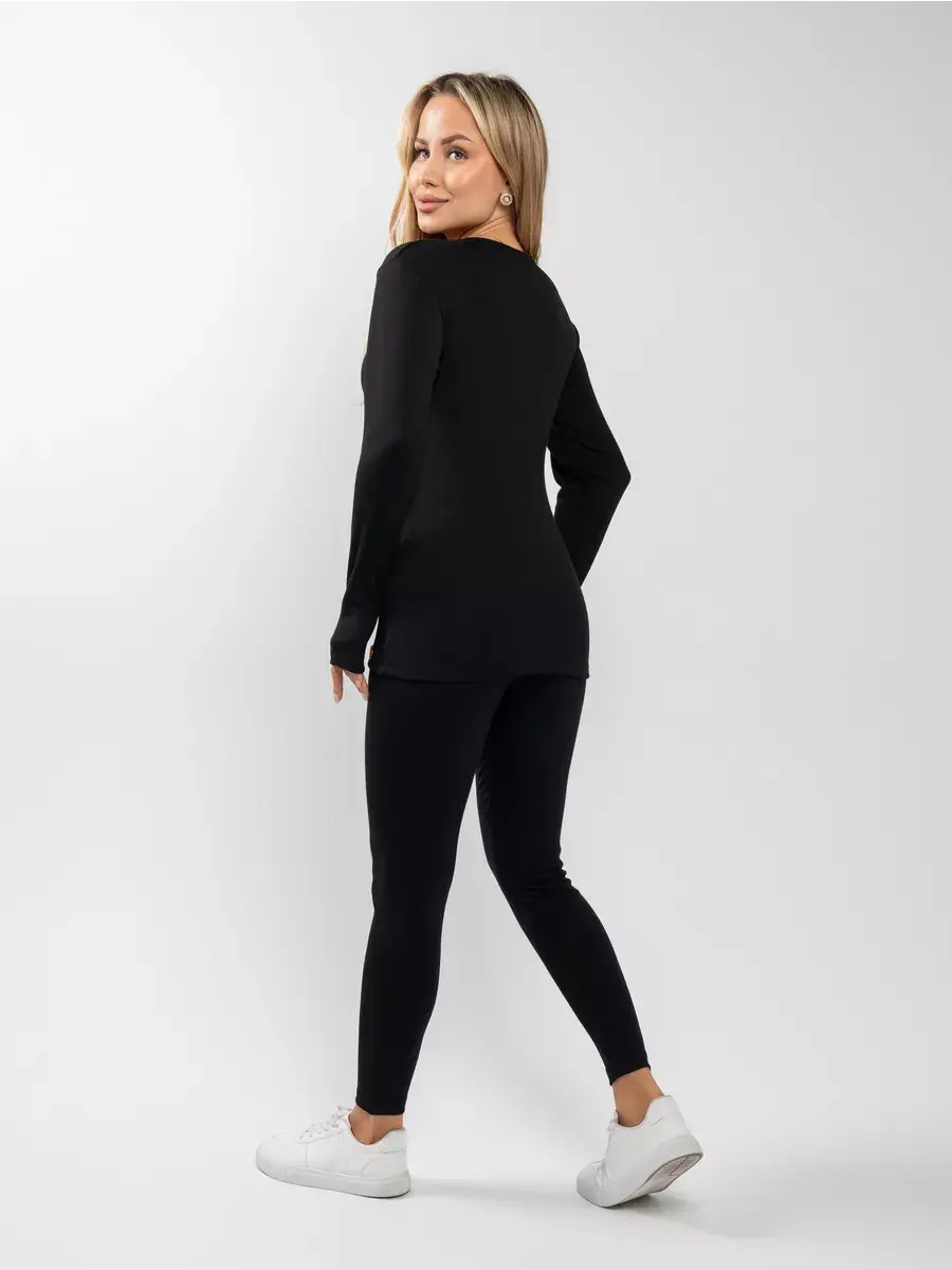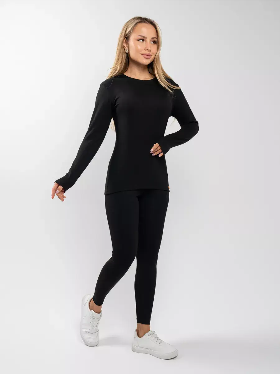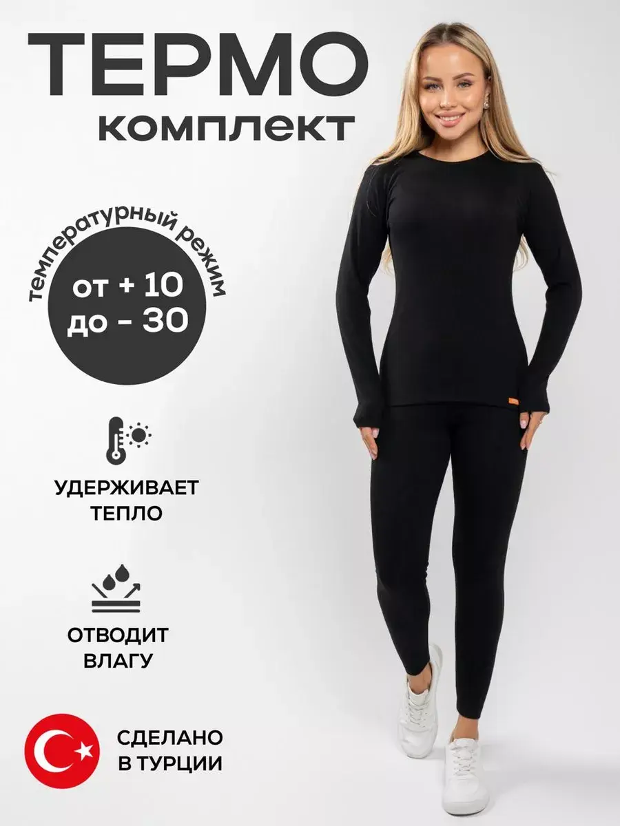 Комплект термобелья из лонгслива и леггинсов, длина которых 7/8. Выполнен из термоволокна с добавлением вискозы и эластана. Необходим как для активного образа жизни, так и для неспешных долгих прогулок на свежем воздухе в морозную погоду. Преимущество термобелья в том, что оно регулирует теплообмен. Обычная хлопковая или шерстяная ткань поглощает пот с поверхности кожи, и поэтому через некоторое время тело начинает замерзать. Термоволокно же сохраняет тепло, вырабатываемое телом, и при этом отводит лишнюю влагу, что снижает до минимума риск переохладиться или перегреться. Термоволокно обладает также антибактериальными свойствами, не создает условий для размножения микроорганизмов, предупреждая появление неприятных запахов. Термобелье приятно к телу, не вызывает раздражения, легко стирается и сушится. Его отличает анатомический крой и плоские швы. Удобная мягкая резинка у леггинсов не сковывает движений. Комплект очень мягкий, хорошо прилегает к телу, что его делает практически незаметным под одеждой.