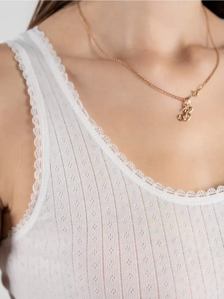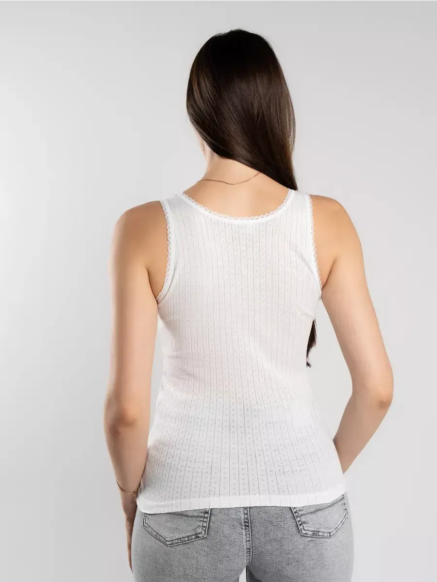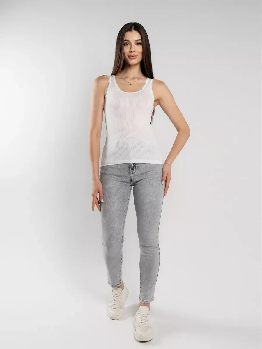 Женская майка на толстых бретелях из высококачественного 100% хлопкового кулирного полотна. Бретели и вырез декорированы ажурной тесьмой. Майка приятно прилегает к телу и не вызывает раздражения кожи. Отлично сочетается с джинсами, шортами, с деловым и спортивным стилем одежды. Подходит как для повседневной носки как самостоятельная единица одежды, так и в качестве нательной майки под джемпер, свитер и пр. Идеальна для спортивных тренировок и занятий фитнесом. Невероятно мягкая и приятная на ощупь. За счет отсутствия боковых швов майка не деформируется в результате многочисленных стирок и сохраняет свою форму.