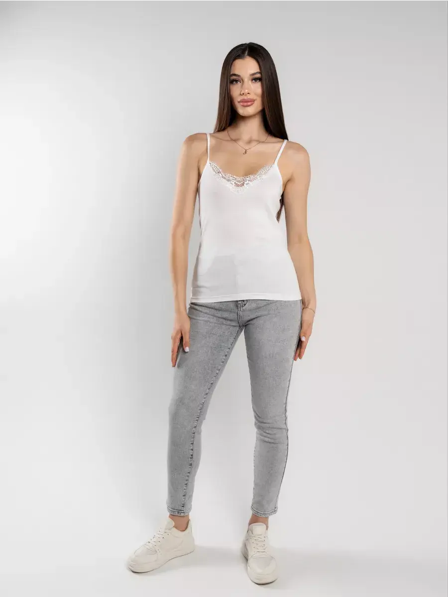 Женская майка на тонких бретелях из высококачественного 100% хлопкового полотна. Вырез декорирован ажурной тесьмой. Майка приятно прилегает к телу и не вызывает раздражения кожи. Отлично сочетается с джинсами, шортами, с деловым и спортивным стилем одежды. Подходит как для повседневной носки как самостоятельная единица одежды, так и в качестве нательной майки под джемпер, свитер и пр. Идеальна для спортивных тренировок и занятий фитнесом. Невероятно мягкая и приятная на ощупь. За счет отсутствия боковых швов майка не деформируется в результате многочисленных стирок и сохраняет свою форму.