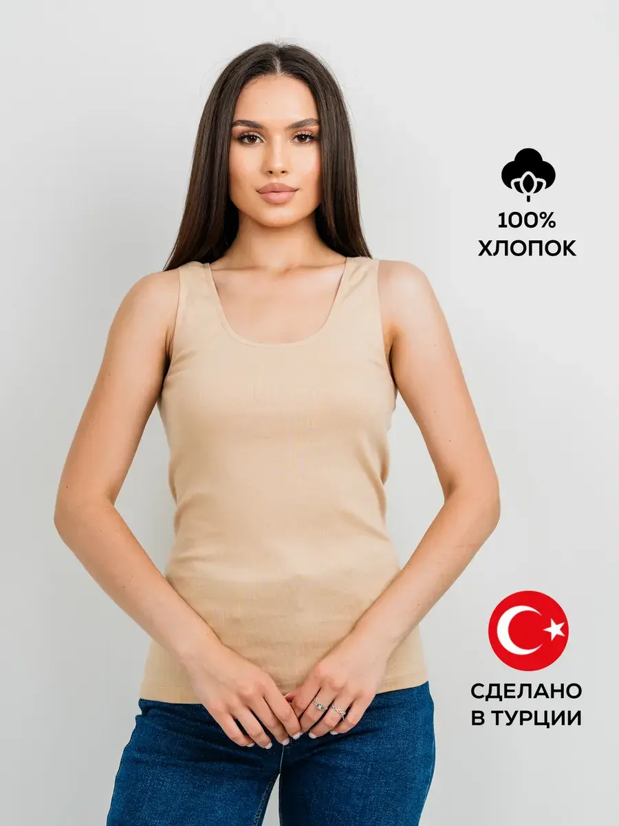 Женская майка на широких бретелях из высококачественного 100% хлопка. Майка приятно прилегает к телу и не вызывает раздражения кожи. Отлично сочетается с джинсами, шортами, с деловым и спортивным стилем одежды. Подходит как для повседневной носки как самостоятельная единица одежды, так и в качестве нательной майки под джемпер, свитер и пр. Идеальна для спортивных тренировок и занятий фитнесом.
