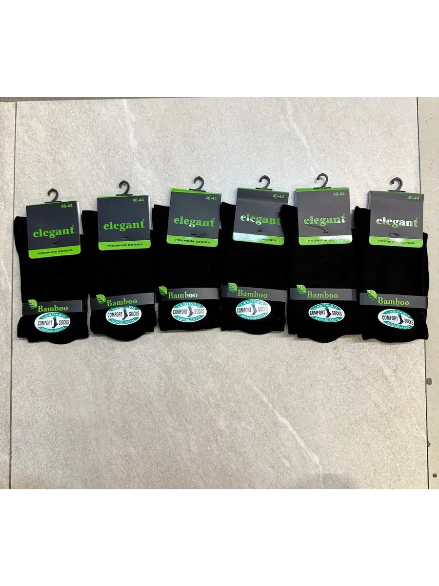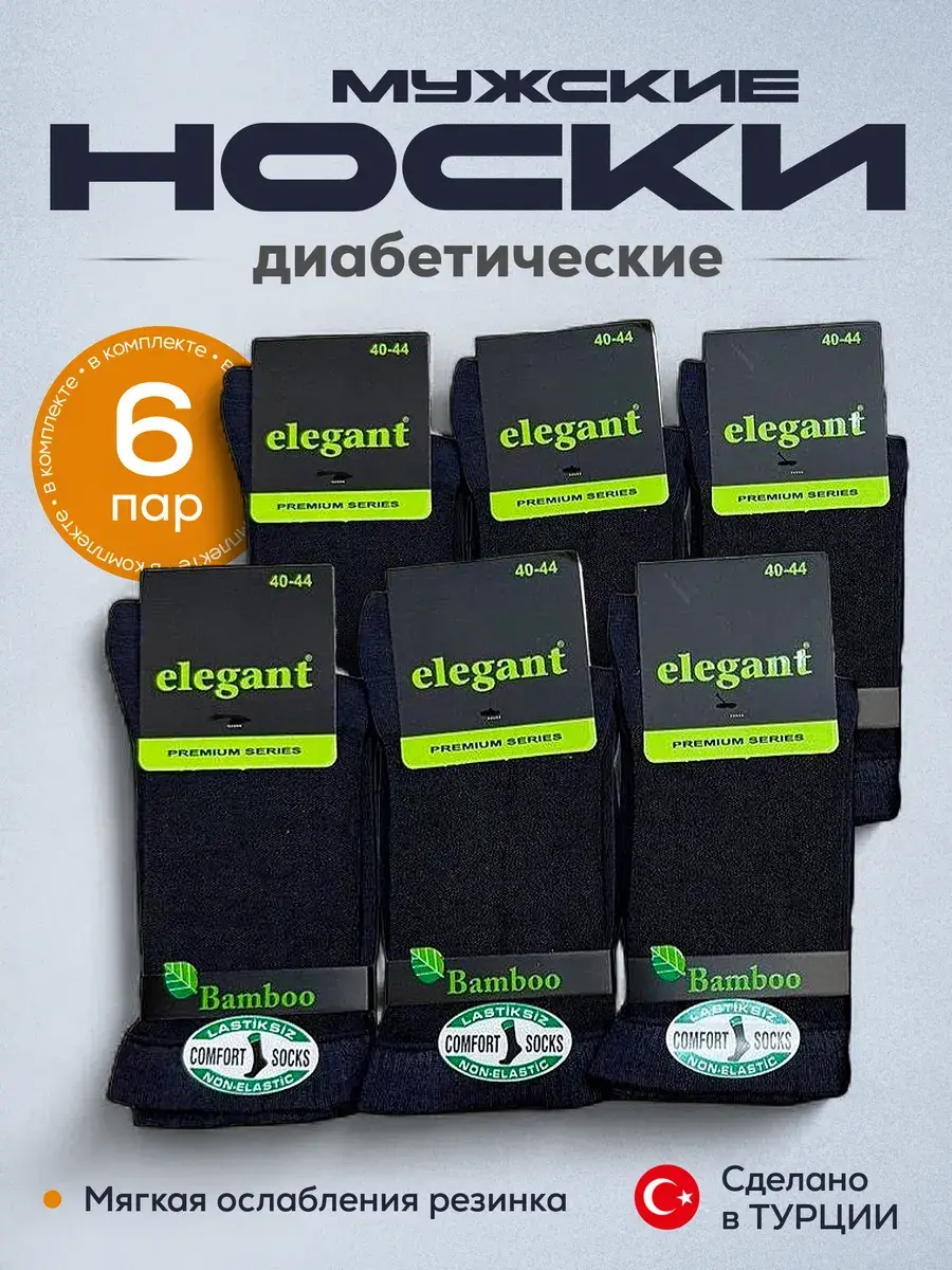 Комплект из 6 пар ароматизированных мужских бамбуковых носков черного цвета. Носки отличает ослабленная мягкая резинка, которая не передавливает щиколотку. В Турции данная модель называется "диабетик", то есть она показана даже мужчинам с медицинскими заболеваниями ног. Бамбуковое трикотажное полотно, из которого произведены данные носки, - это экологичная тань, которая не содержит в составе токсичных компонентов. Материал обладает антимикробным действием. Бамбуковое полотно мягче хлопка и даже кашемира. Изделия из бамбука хорошо пропускают воздух, позволяя коже дышать. Мысок и пятка дополнительно усилены.