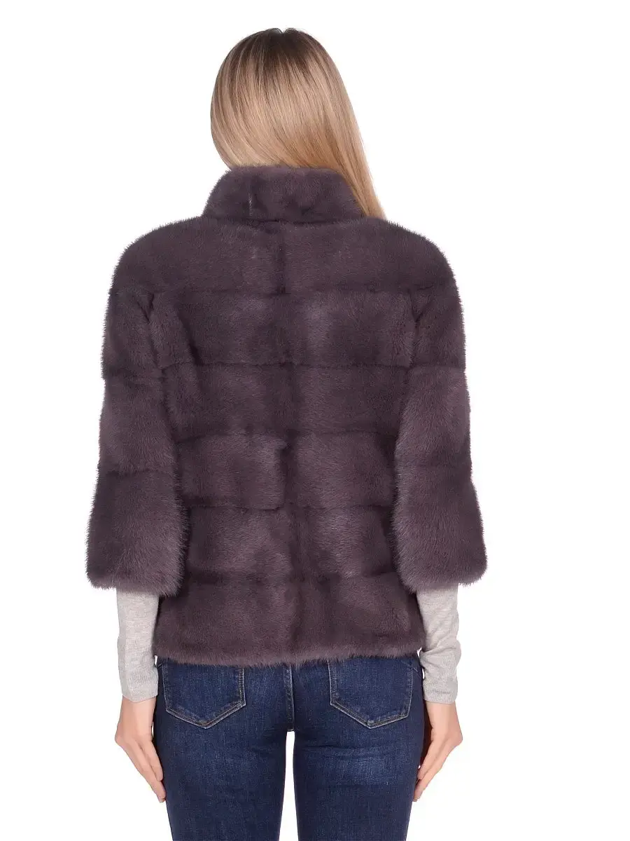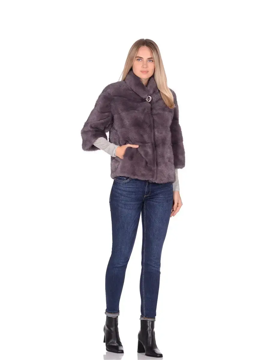 Современная модель норки прямого силуэта с воротником стойкой, рукавами 7/8, застежкой на крючки и пуговицу и прорезными карманами. Для более плотного прилегания, сверху воротника имеется дополнительный крючок. Можно изменить силуэт жакета на приталенный, стянув внутри изделия специальную кулиску, которая также имеется по низу рукавов, тем самым позволяя при ее стягивании сделать рукава более узкими и защитить руки от ветра. На подкладке в боковом шве имеется специальный кармашек на молнии, позволяющий проверить качество мездры. Жакет имеет необычный оттенок меха, делающий свою обладательницу изысканной и индивидуальной. Легкость, износостойкость и привлекательный вид данного меха дают изделию неоспоримое конкурентное преимущество.