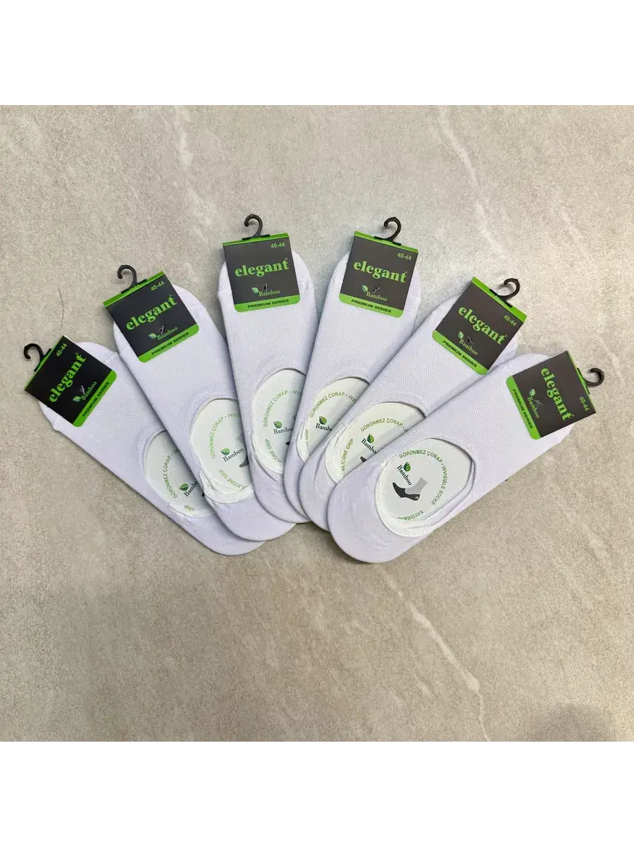 Комплект из шести пар мужских следков белого цвета. Бамбуковое трикотажное полотно, из которого произведены данные следки, - это экологичная тань, которая не содержит в составе токсичных компонентов. Материал обладает антимикробным действием. Бамбуковое полотно мягче хлопка и даже кашемира. Изделия из бамбука хорошо пропускают воздух, позволяя коже дышать. Мысок дополнительно усилен. На пятке имеются силиконовые резинки, которые не позволяют следку сползать. Изделие подходит для любой летней обуви.