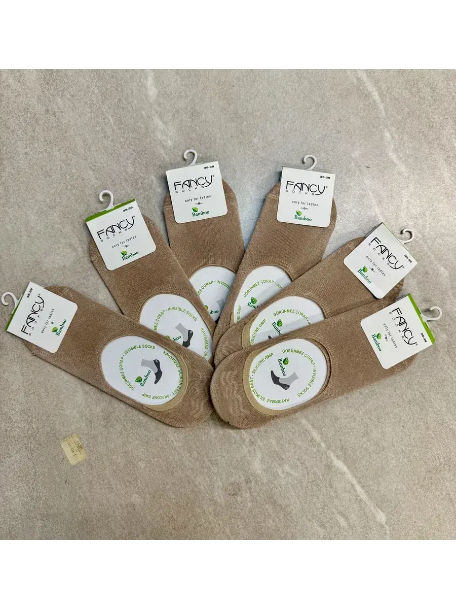 Комплект из шести пар женских следков бежевого цвета. Бамбуковое трикотажное полотно, из которого произведены данные следки, - это экологичная тань, которая не содержит в составе токсичных компонентов. Материал обладает антимикробным действием. Бамбуковое полотно мягче хлопка и даже кашемира. Изделия из бамбука хорошо пропускают воздух, позволяя коже дышать. Мысок дополнительно усилен. На пятке имеются силиконовые резинки, которые не позволяют следку сползать. Изделие подходит для любой летней обуви.